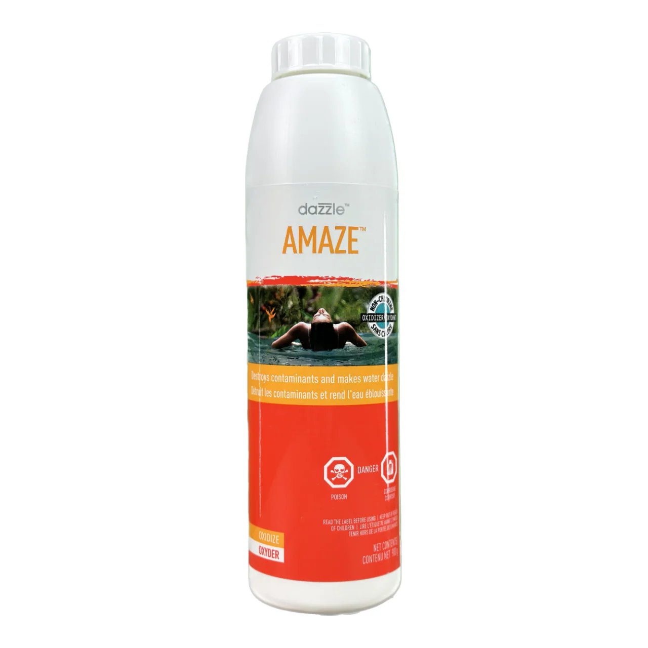 • Can be used with chlorine but will not boost chlorine levels – if a boost is needed, use Dazzle Stabilized Chlorine Granules or switch to Amaze Plus